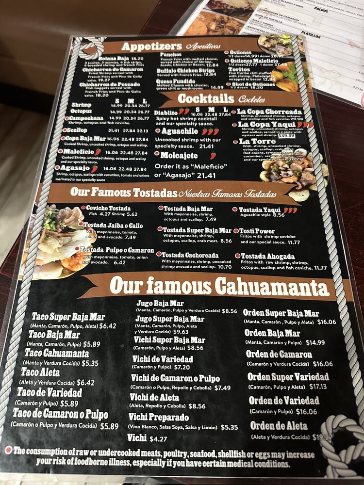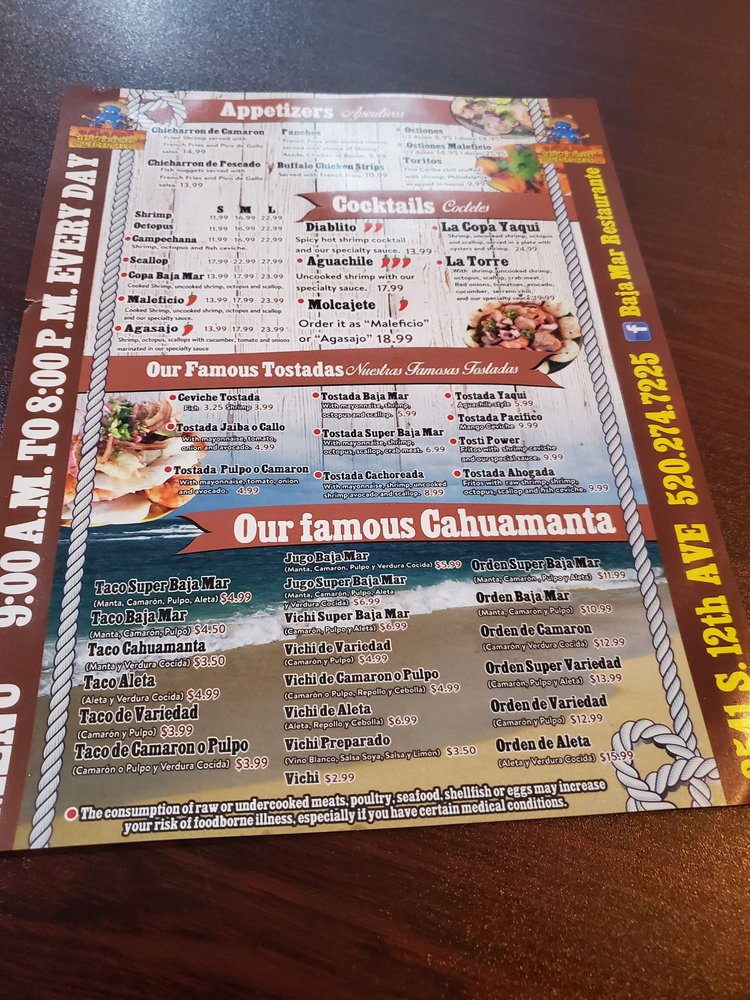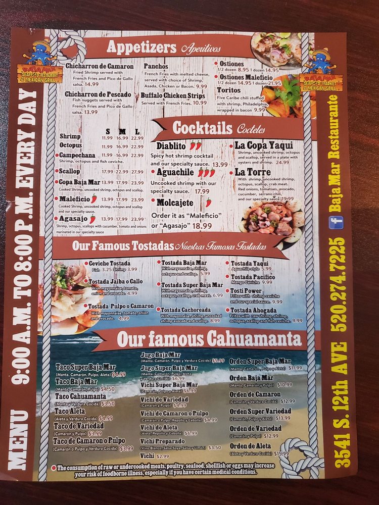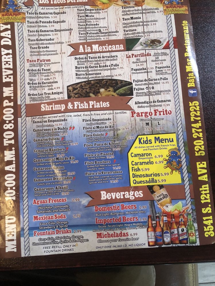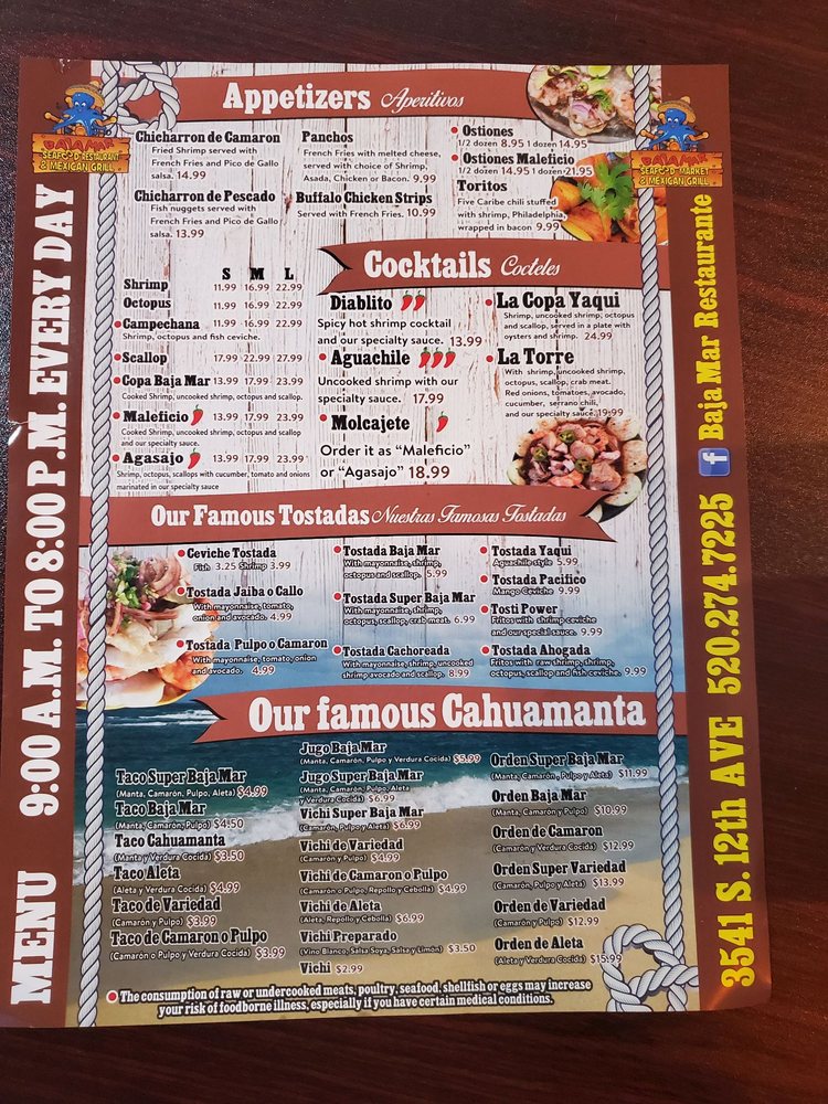 Baja Mar Restaurante in Tucson, AZ offers a delightful seafood experience with a Mexican twist. Their menu boasts a variety of tantalizing dishes such as the award-worthy Taco Volteado and the mouthwatering Torito appetizer. Customers praise the impeccable service and the made-to-order meals. Cocktails like the Maleficio and La Torre are popular choices that showcase the restaurant's commitment to using fresh seafood. While some customers have noted issues with music volume, the majority rave about the delicious flavors and friendly atmosphere. Don't miss out on their Garlic Shrimp or the Dorados Tacos & Red Snapper. With reasonable prices and a great selection of dishes, Baja Mar Restaurante is a must-visit for seafood lovers.